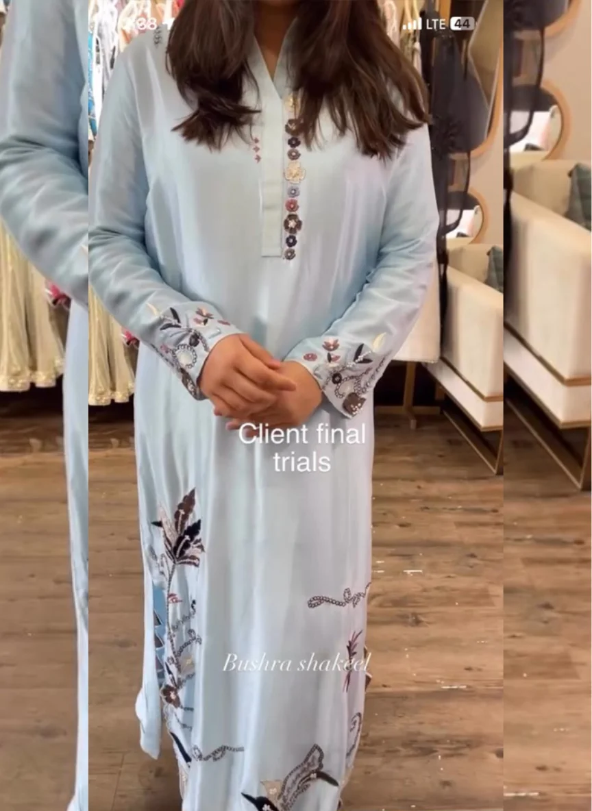 A mesmerizing ice blue long shirt, exquisitely hand-embroidered with delicate detailing that exudes timeless elegance. Paired with plain trousers for a sleek, refined look, the ensemble is completed with an organza dupatta featuring a beautifully crafted motif at its center, adding a subtle yet captivating focal point. The soft hue and intricate craftsmanship make this outfit a perfect choice for daytime festivities or elegant evening gatherings.