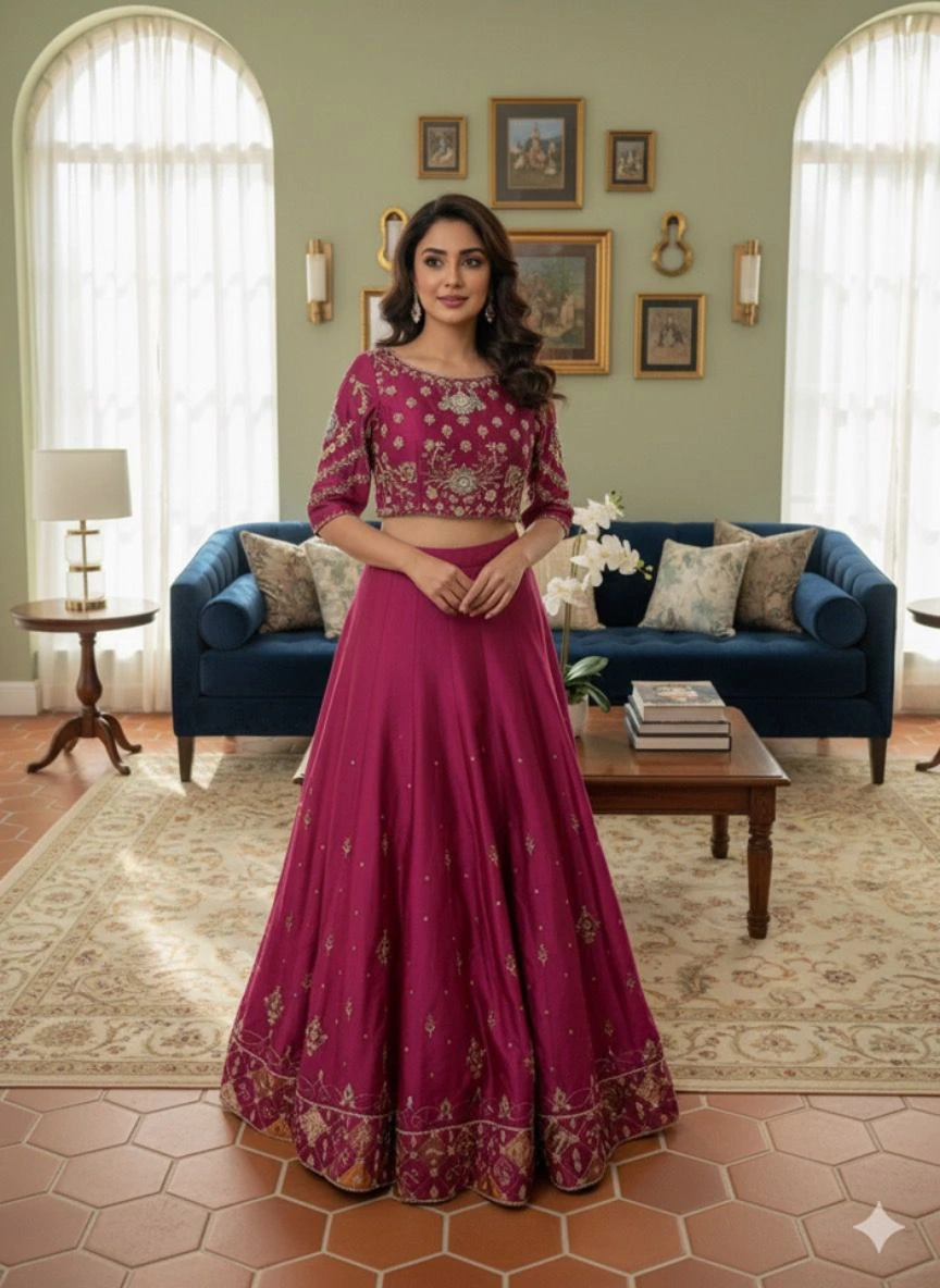 A vibrant magenta pink choli lehenga beautifully adorned with intricate hand embellishments, creating a stunning blend of traditional charm and contemporary elegance — perfect for a statement bridal or festive look.
