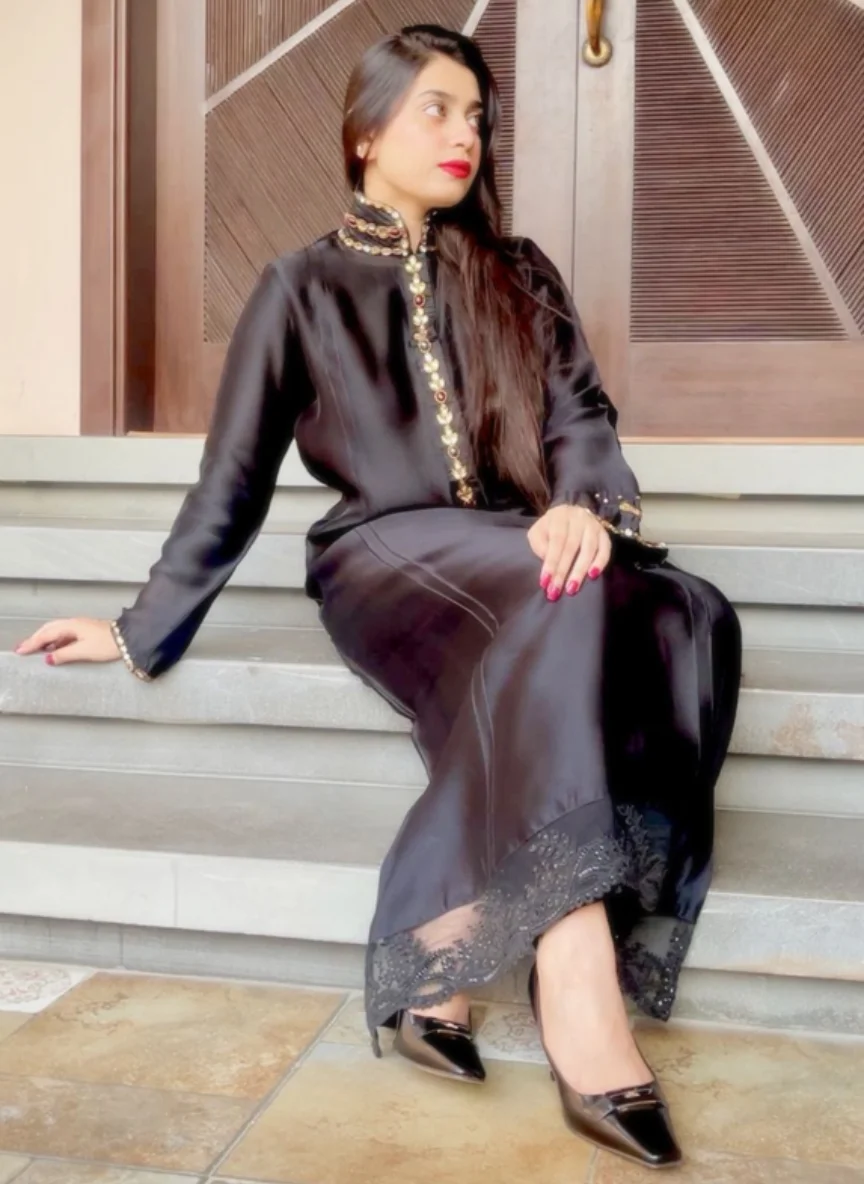 A radiant jet black long shirt with plain trouser paired with stripes dupatta. This ensemble perfectly blends traditional elegance with contemporary sophistication — ideal for festive gatherings or refined daytime occasions.